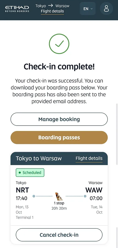 成田〜アブダビ〜ワルシャワ:フライト詳細